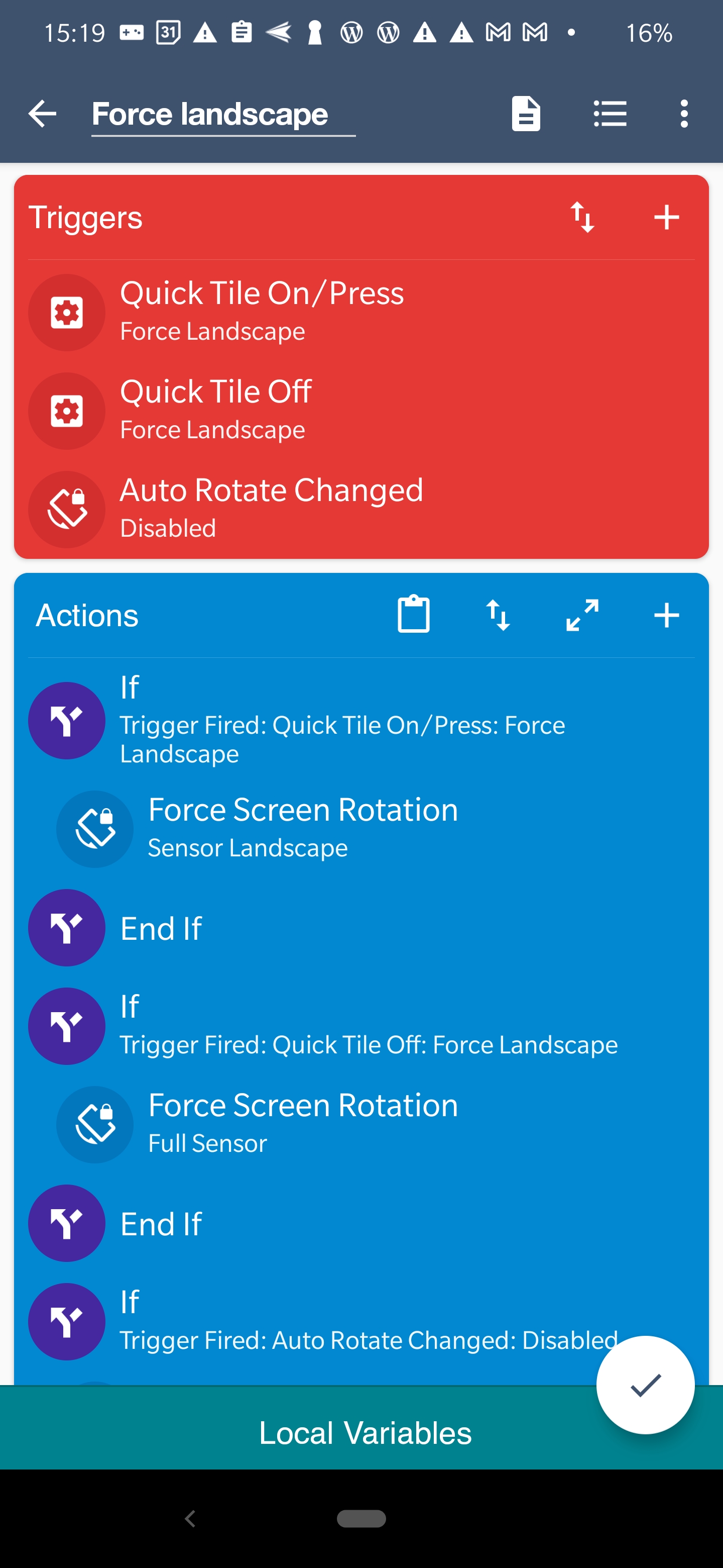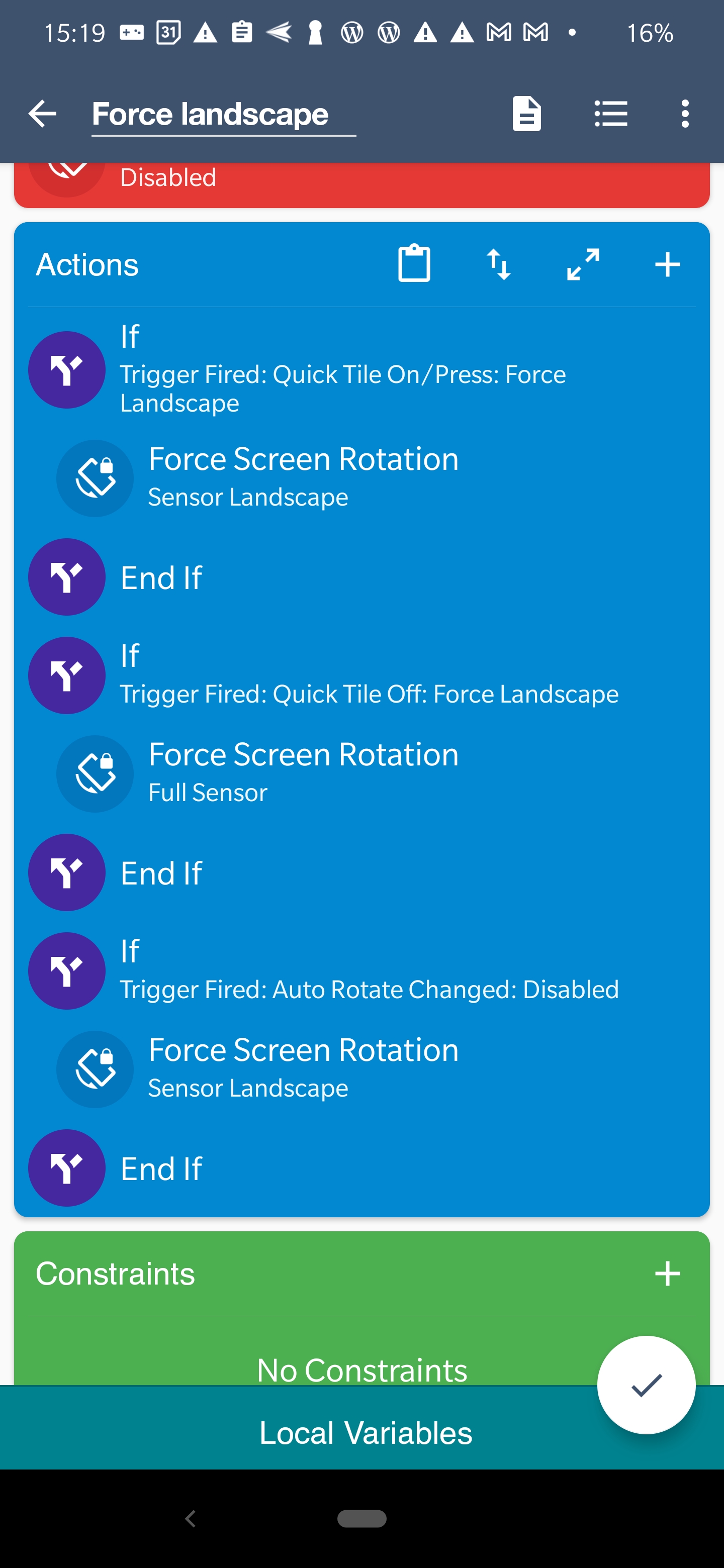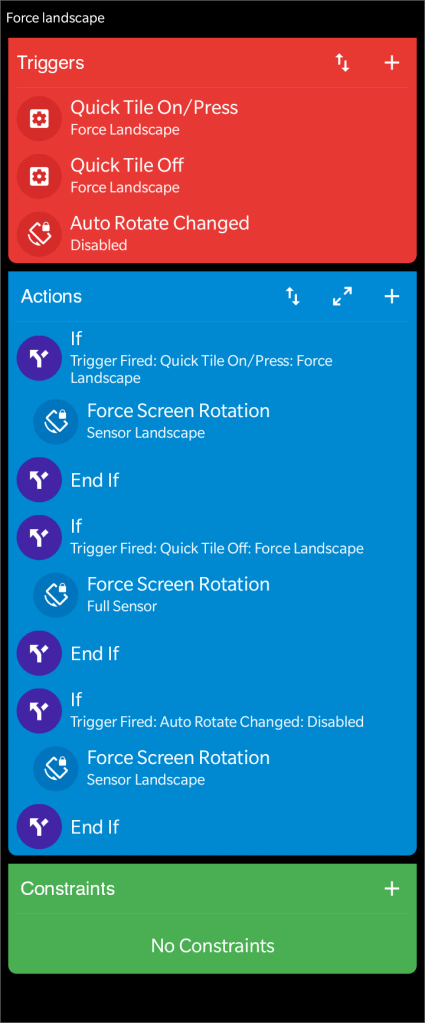 {“localVariables”:[],”m_GUID”:-7970403925759432683,”m_actionList”:[{“m_SIGUID”:-5958388681062548735,”m_classType”:”IfConditionAction”,”m_constraintList”:[{“m_not”:false,”m_siGuidThatInvoked”:-9064470406767257776,”m_triggerName”:”Quick Tile On/Press: Force Landscape”,”m_SIGUID”:-7025851295218967485,”m_classType”:”TriggerThatInvokedConstraint”,”m_constraintList”:[],”m_isDisabled”:false,”m_isOrCondition”:false}],”m_isDisabled”:false,”m_isOrCondition”:false},{“m_option”:7,”m_SIGUID”:-8374202639623926197,”m_classType”:”ForceScreenRotationAction”,”m_constraintList”:[],”m_isDisabled”:false,”m_isOrCondition”:false},{“m_SIGUID”:-7417599871282100460,”m_classType”:”EndIfAction”,”m_constraintList”:[],”m_isDisabled”:false,”m_isOrCondition”:false},{“m_SIGUID”:-5713997661551091969,”m_classType”:”IfConditionAction”,”m_constraintList”:[{“m_not”:false,”m_siGuidThatInvoked”:-5033122898272114489,”m_triggerName”:”Quick Tile Off: Force Landscape”,”m_SIGUID”:-8920659603761747173,”m_classType”:”TriggerThatInvokedConstraint”,”m_constraintList”:[],”m_isDisabled”:false,”m_isOrCondition”:false}],”m_isDisabled”:false,”m_isOrCondition”:false},{“m_option”:9,”m_SIGUID”:-6561567899359431940,”m_classType”:”ForceScreenRotationAction”,”m_constraintList”:[],”m_isDisabled”:false,”m_isOrCondition”:false},{“m_SIGUID”:-7972464386165823673,”m_classType”:”EndIfAction”,”m_constraintList”:[],”m_isDisabled”:false,”m_isOrCondition”:false},{“m_SIGUID”:-7086984044032655284,”m_classType”:”IfConditionAction”,”m_constraintList”:[{“m_not”:false,”m_siGuidThatInvoked”:-6031533465078420791,”m_triggerName”:”Auto Rotate Changed: Disabled”,”m_SIGUID”:-6786516390282144451,”m_classType”:”TriggerThatInvokedConstraint”,”m_constraintList”:[],”m_isDisabled”:false,”m_isOrCondition”:false}],”m_isDisabled”:false,”m_isOrCondition”:false},{“m_option”:7,”m_SIGUID”:-6534806150783650704,”m_classType”:”ForceScreenRotationAction”,”m_constraintList”:[],”m_isDisabled”:false,”m_isOrCondition”:false},{“m_SIGUID”:-8705177921301635547,”m_classType”:”EndIfAction”,”m_constraintList”:[],”m_isDisabled”:false,”m_isOrCondition”:false}],”m_category”:”Quick Setting Tiles”,”m_constraintList”:[],”m_description”:””,”m_descriptionOpen”:false,”m_enabled”:true,”m_excludeLog”:false,”m_headingColor”:-855310,”m_isOrCondition”:false,”m_name”:”Force landscape”,”m_triggerList”:[{“m_tileOption”:3,”m_toggleOption”:0,”fakeIcon”:2131231017,”m_SIGUID”:-9064470406767257776,”m_classType”:”QuickSettingsTileTrigger”,”m_constraintList”:[],”m_isDisabled”:false,”m_isOrCondition”:false},{“m_tileOption”:3,”m_toggleOption”:1,”fakeIcon”:2131231017,”m_SIGUID”:-5033122898272114489,”m_classType”:”QuickSettingsTileTrigger”,”m_constraintList”:[],”m_isDisabled”:false,”m_isOrCondition”:false},{“m_option”:1,”fakeIcon”:2131231017,”m_SIGUID”:-6031533465078420791,”m_classType”:”AutoRotateChangeTrigger”,”m_constraintList”:[],”m_isDisabled”:false,”m_isOrCondition”:false}]}